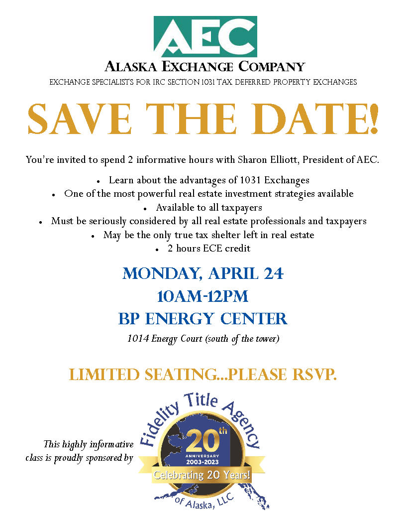 Join one of our Affiliate Business Partners, Fidelity Title Agency of Alaska for this in-person 1031 Exchange Class (Course C2024 - 2 ECE).