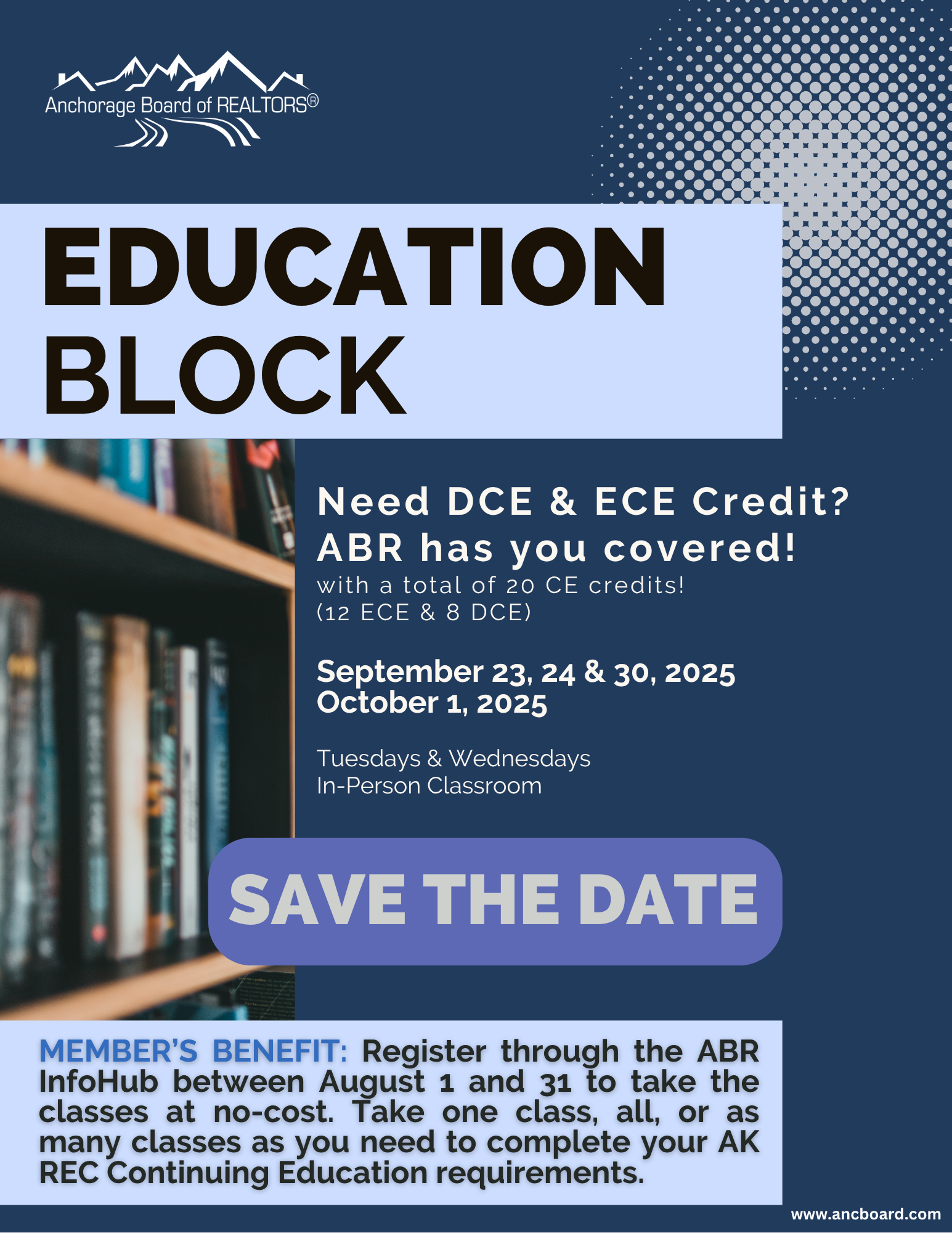 Receive education for free when you register between August 1 - 31 using the ABR Infohub. Take one class, all, or as many classes as you need to complete your AK REC Continuing Education requirements.