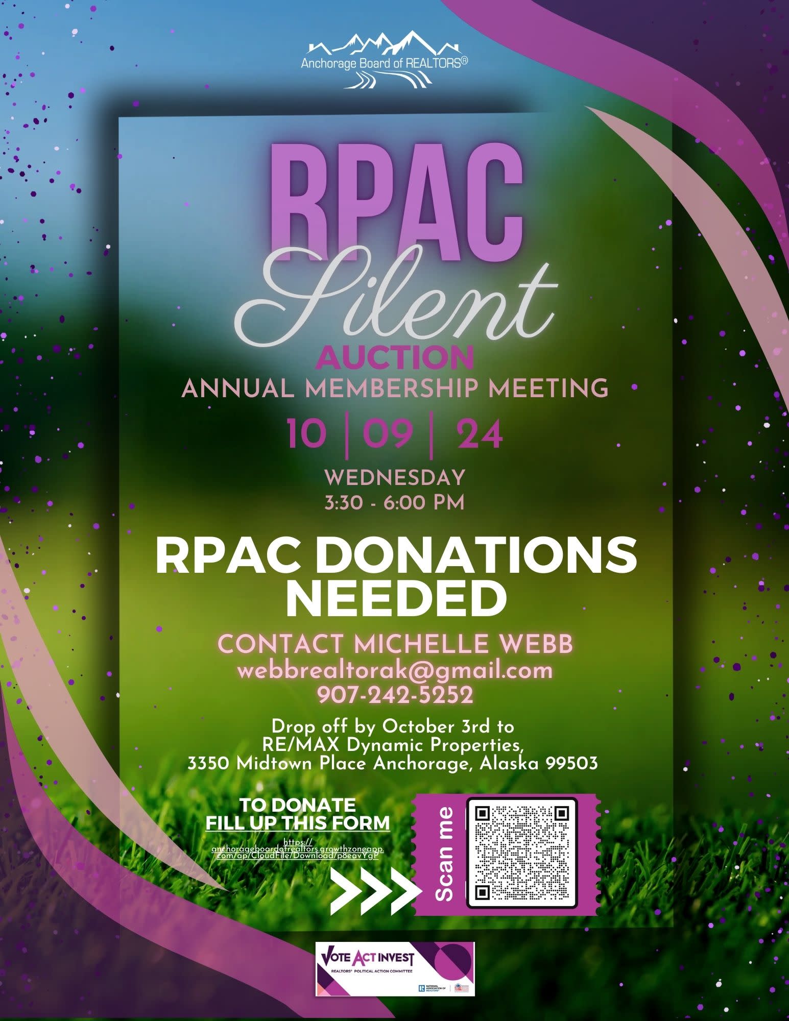 RPAC Silent Auction. We are looking for help to make our RPAC auction during the Annual Membership Meeting a success! If you are interested in volunteering, please sign up by clicking this LINK. For those planning to donate, kindly complete THIS FORM and submit it to Michelle Webb by October 4th. For more information or questions, please reach out to Michelle Webb, our ABR RPAC Chair, at webbrealtorak@gmail.com or via text at 907-242-5252.