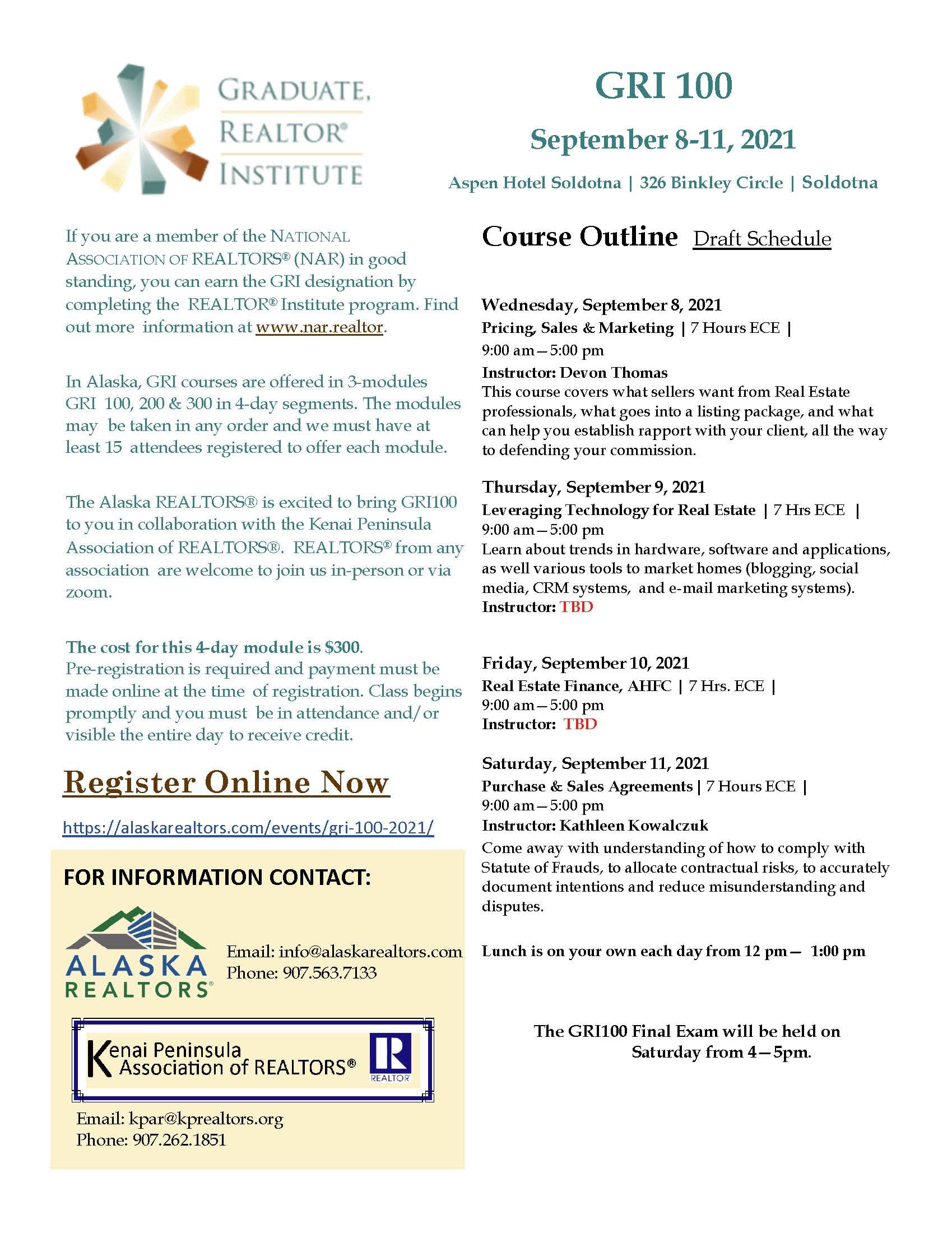 Need more information about GRI? Contact Alaska REALTORS® by emailing: info@alaskarealtors.com.