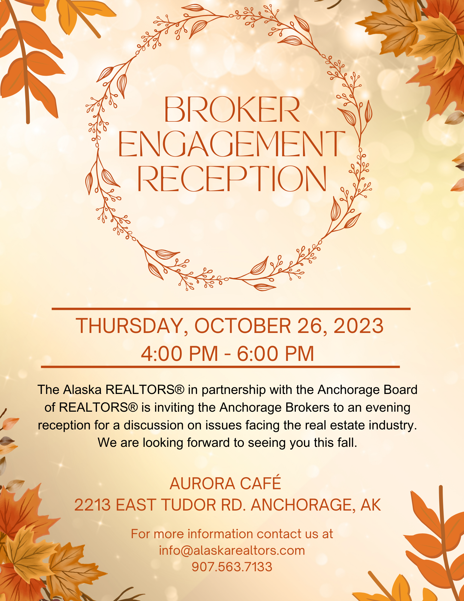 The Alaska REALTORS® in partnership with the Anchorage Board of REALTORS® is inviting the Anchorage Brokers and Associate Brokers in Charge to an evening reception for a roundtable discussion on issues facing the real estate industry.