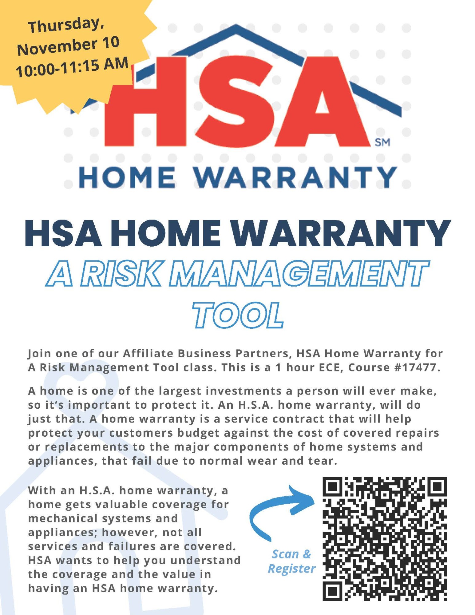 Join one of our Affiliate Business Partners, HSA Home Warranty for A Risk Management Tool class. This is a 1 hour ECE, Course #17477.
