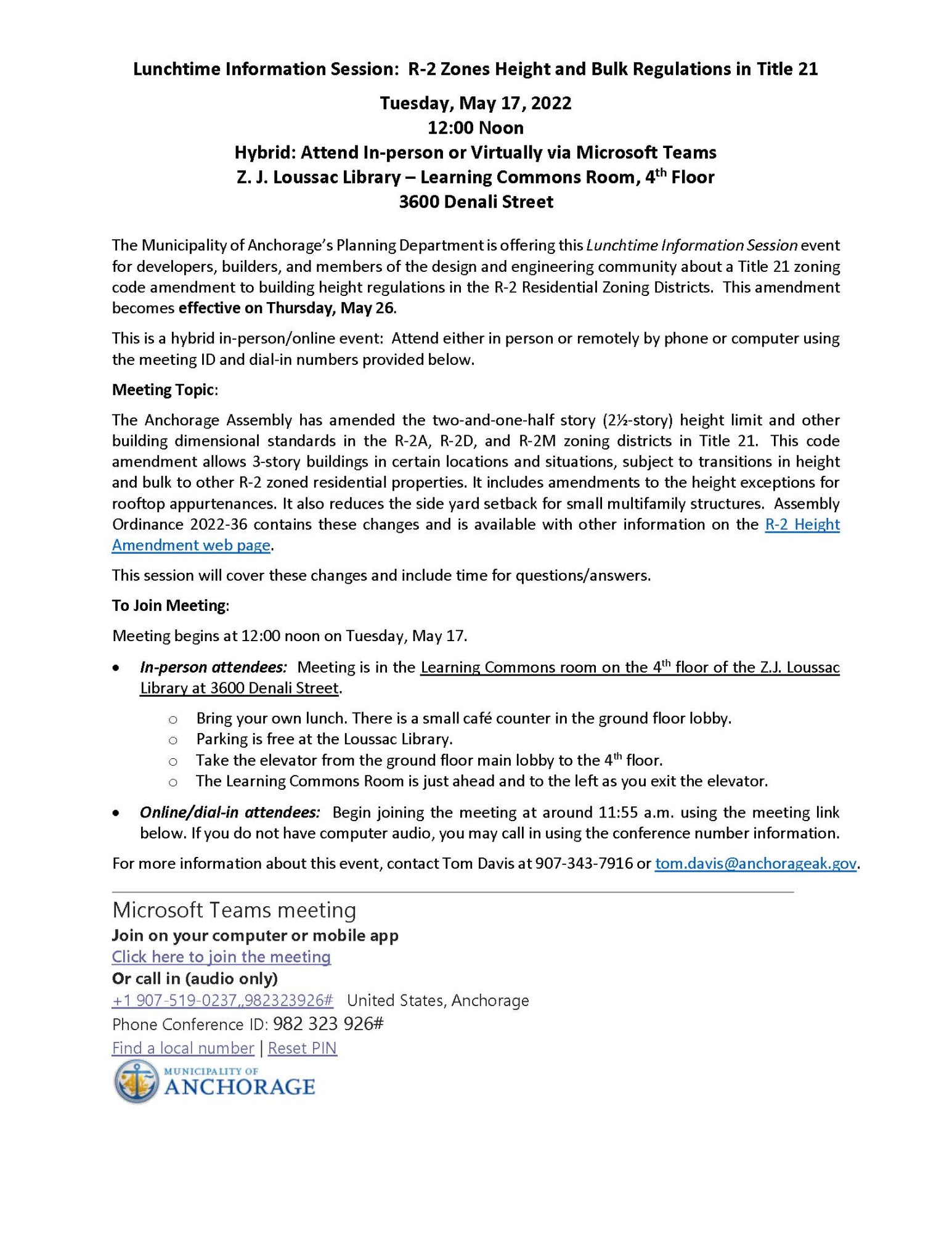 The Municipality of Anchorage’s Planning Department is offering this Lunchtime Information Session event for developers, builders, and members of the design and engineering community about a Title 21 zoning code amendment to building height regulations in the R-2 Residential Zoning Districts.