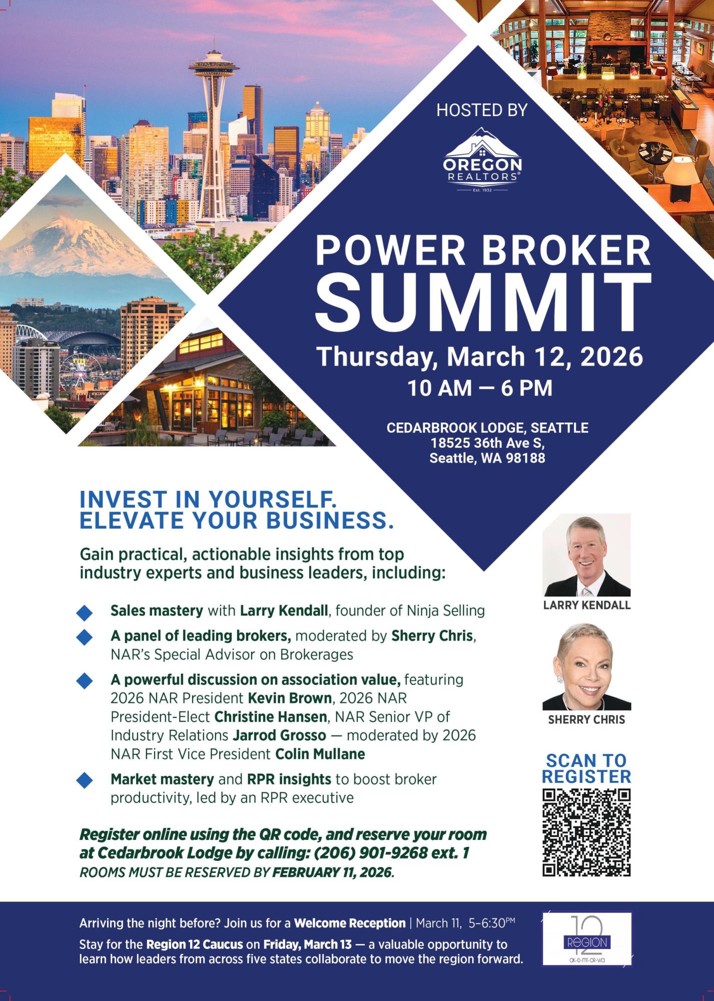 Register online at https://www.eventleaf.com/Attendee/Attendee/EventPage?eId=lurhPX2JDFNF4Xa1D%2FXvDw%3D%3D, and reserve your room at Cedarbrook Lodge by calling: (206) 901-9268 ext. 1. Rooms must be reserved by February 11, 2026.