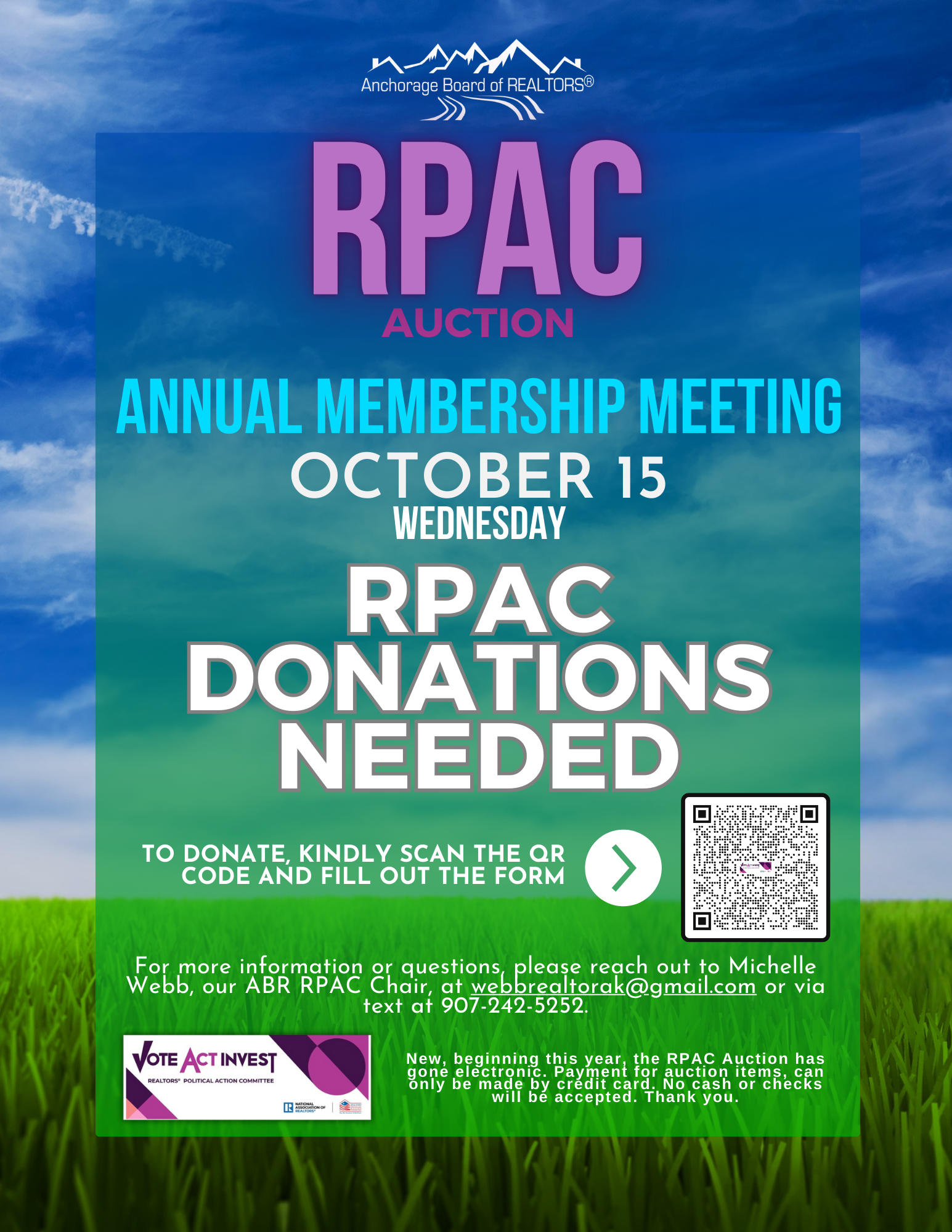 RPAC Silent Auction. We'll be holding a RPAC Silent Auction during this event. For those planning to donate an auction item, kindly complete THIS FORM and submit by October 3rd. For more information or questions, please reach out to Michelle Webb, our ABR RPAC Chair, at webbrealtorak@gmail.com or via text at 907-242-5252.